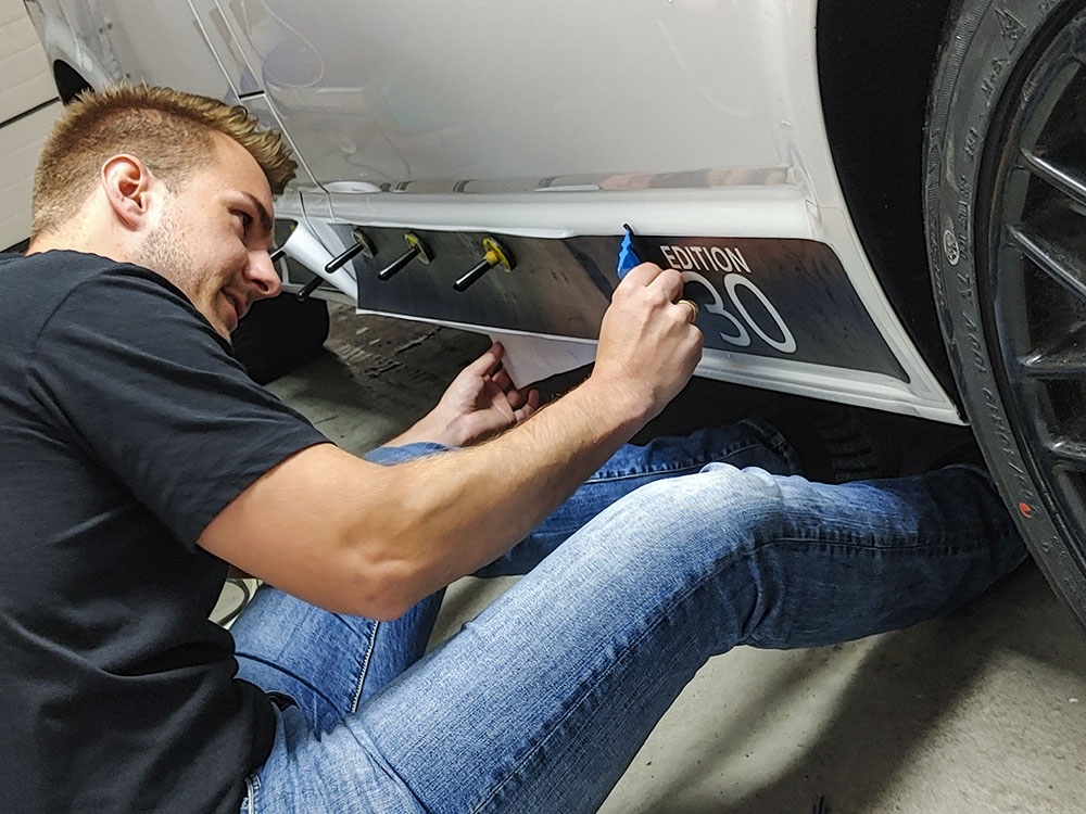 Unsere Seitenstreifen werden mit modernsten Maschinen hergestellt und von Hand ausgehoben, also die überschüssige Folie entfernt und das Motiv somit freigelegt. Jeder Seitenstreifen wird genau nach Ihren Wünschen individuell und exakt für Sie angefertigt!